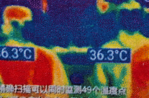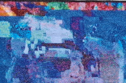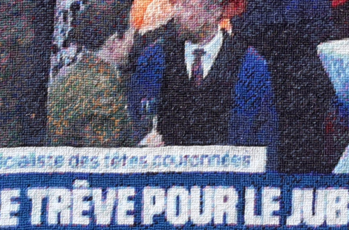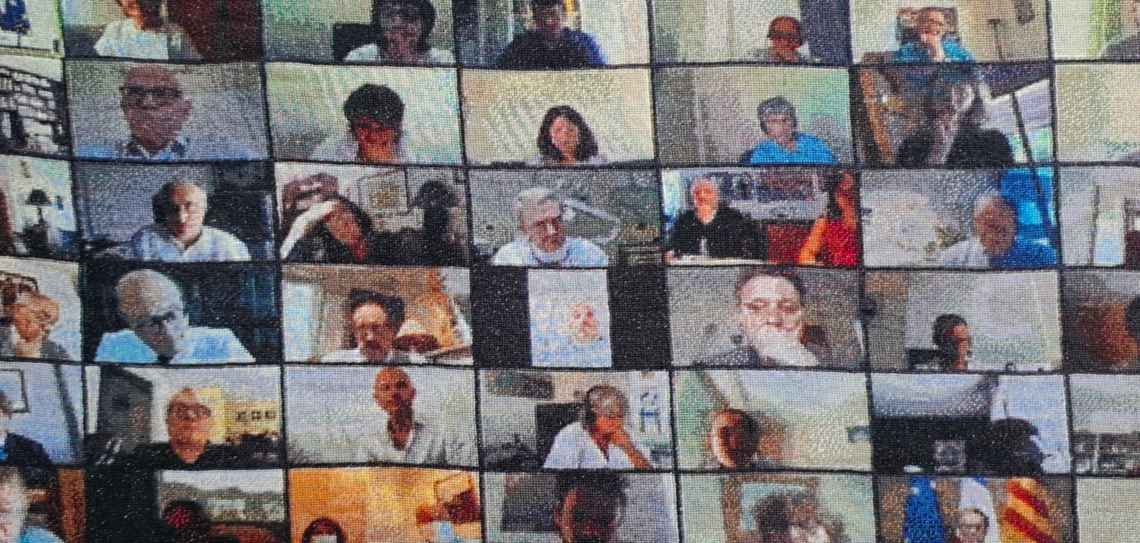 Retransmission du bilan du Ségur de la santé en 2020, une visio-conférence de bilan, obligé par le confinement lié au Covid . Série de portraits en basse résolution, 98 images simultanées, enfermées dans un même cadre comme un slit-screen. Mettre en matière un écran d’ordinateur. tapisserie point/point 41cm/71 cm, 2 pièces Ségur de la santéjuin 20 > avril 21