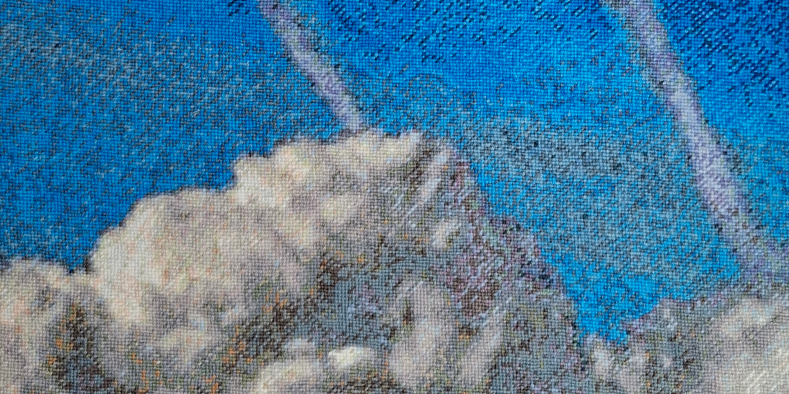 Cette série de 10 tapisseries s’emploie à saisir l’éphémère, capter les traces laissées dans le ciel à l’ère de l’Anthropocène. Cette série de broderies traduit un temps suspendu, une contemplation des formes mouvantes et des empreintes invisibles que l’activité humaine inscrit dans l’atmosphère. Une invitation à la pause. Tapisseries point par point 34cm/46 cm Nuages01février>mars 23 Nuages03avril>juin 23 Nuages04mai>juillet 23 Nuages05juillet>septembre23 Nuages06sept.>novembre 23 Nuages07nov. 23>janvier 24 Nuages08janvier>février 24 Nuages09février>avril 24 Nuages10mars>mai 24 Nuages11juin>septembre 24 Pour ce travail, j’ai eu envie de me détacher de l’actualité et de rechercher une certaine légèreté, faire un pas de côté. J’ai réalisé une série de dix tapisseries sur les nuages. Cela n’as durer qu’un…